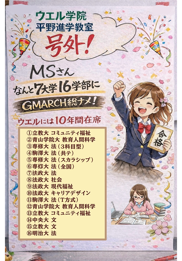 ホーム Home 代表挨拶・学院紹介 Representative greetingAcademy introduction 入室の流れ Flow of entry クラス案内・諸費用 Class guidanceexpenses 合格実績 Pass record いずみ Izumi 保護者様からの声 Voice from parents 塾長ブログ Blog ニュース News